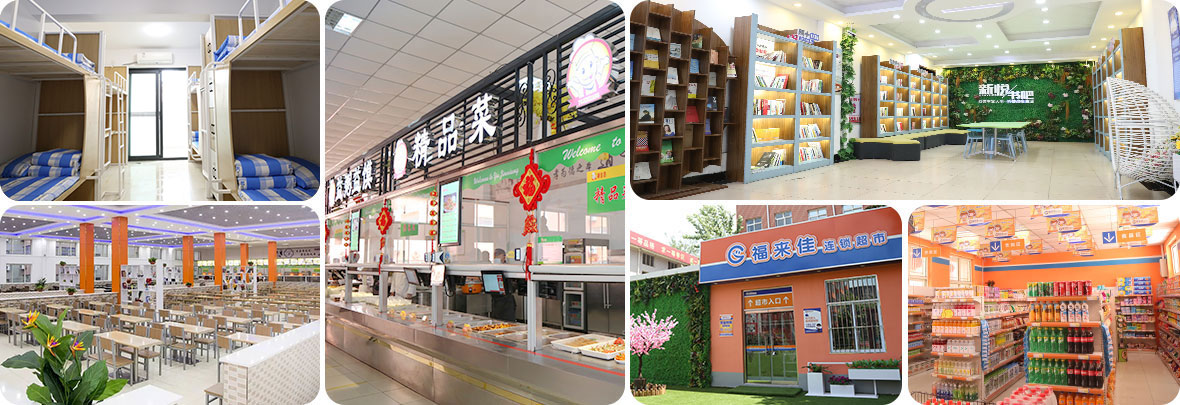 學校配備帶有獨立衛(wèi)生間的宿舍、食堂、超市、借閱室,為學生提供便利校園生活